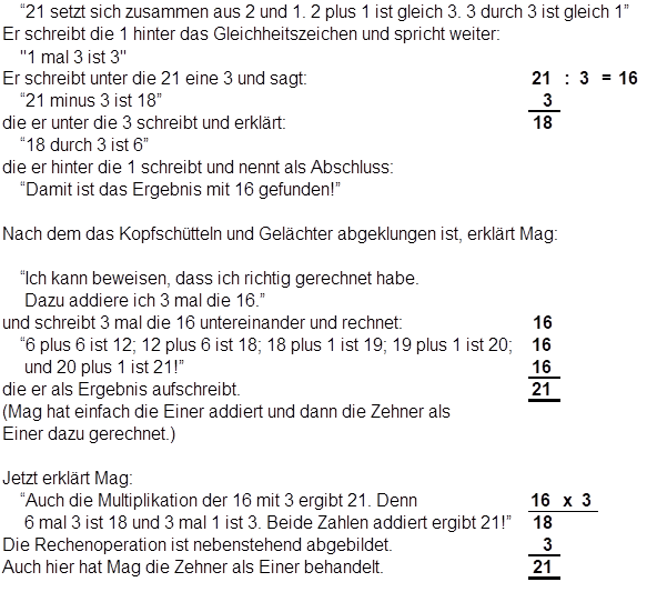 schreibt an die Tafel die Rechenaufgabe 21 : 3 und beginnt mit der Lösung,
